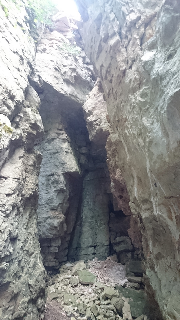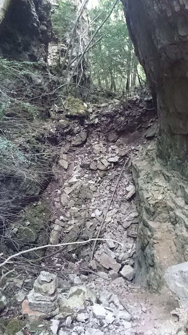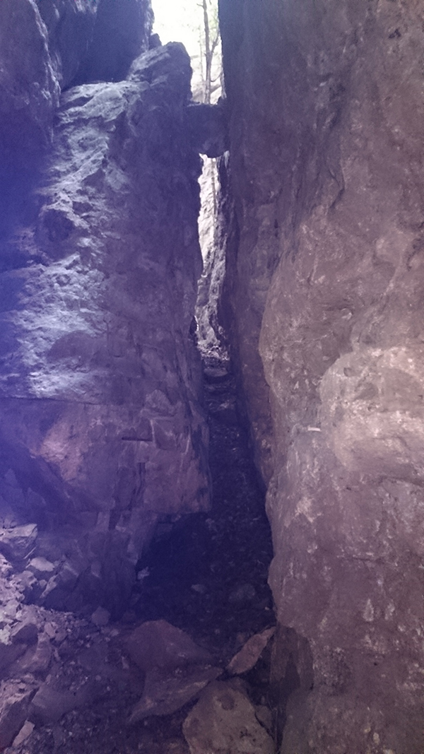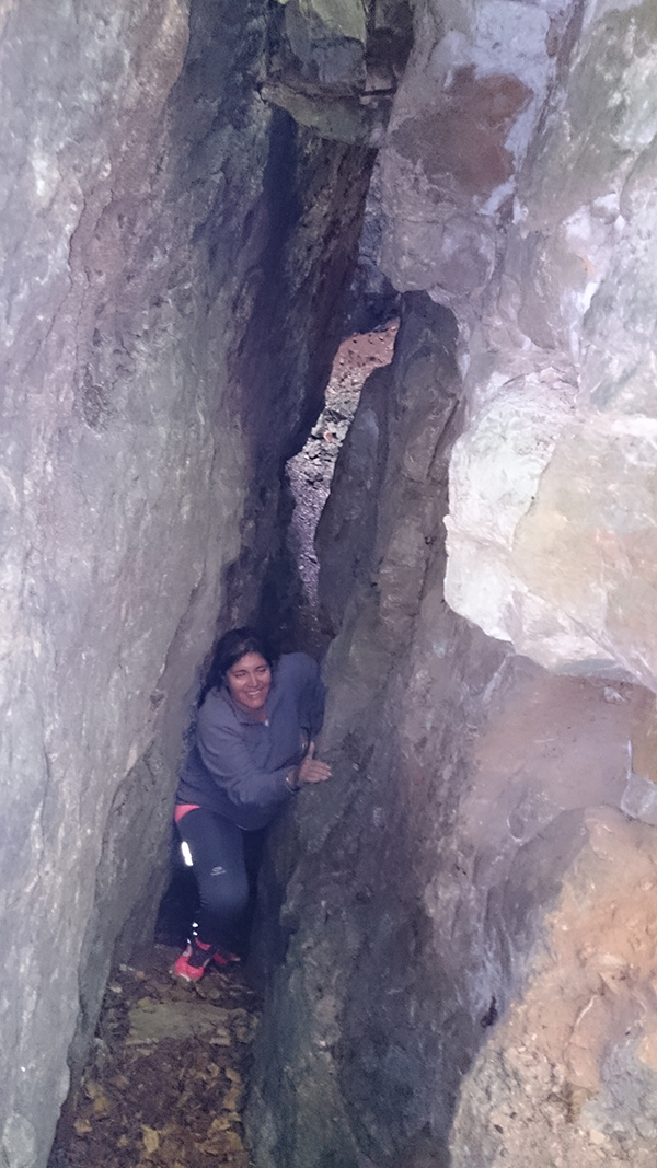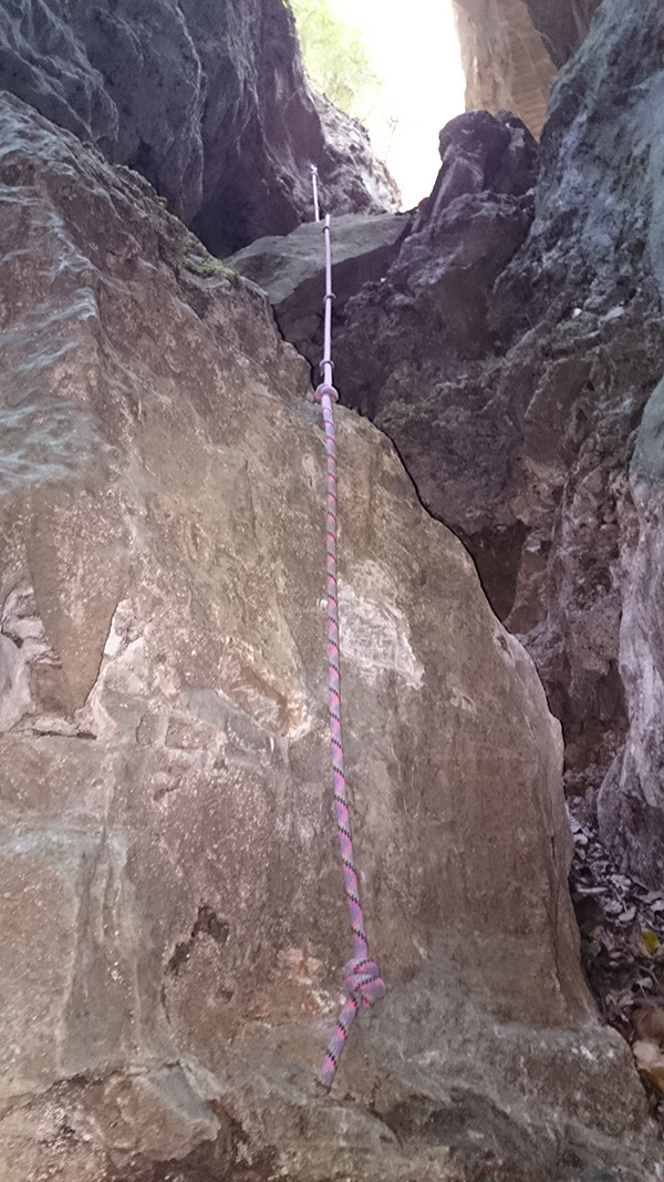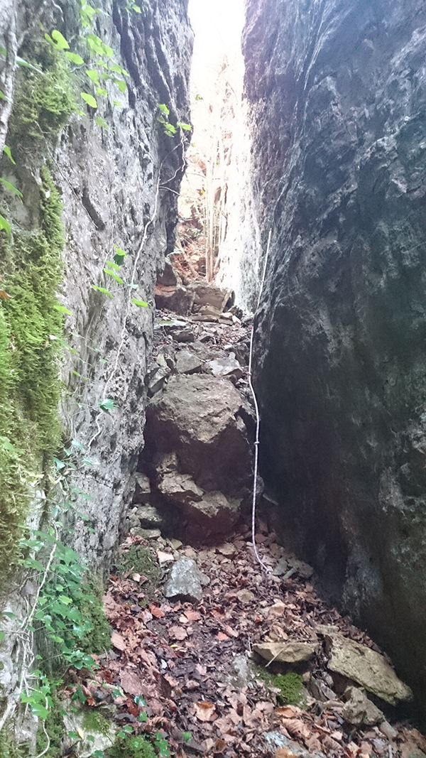 Aquest pas és molt estret però es pot passar, si es fa de baixada en l'últim tram cal ajupir-se, millor no fer-ho anant sol.