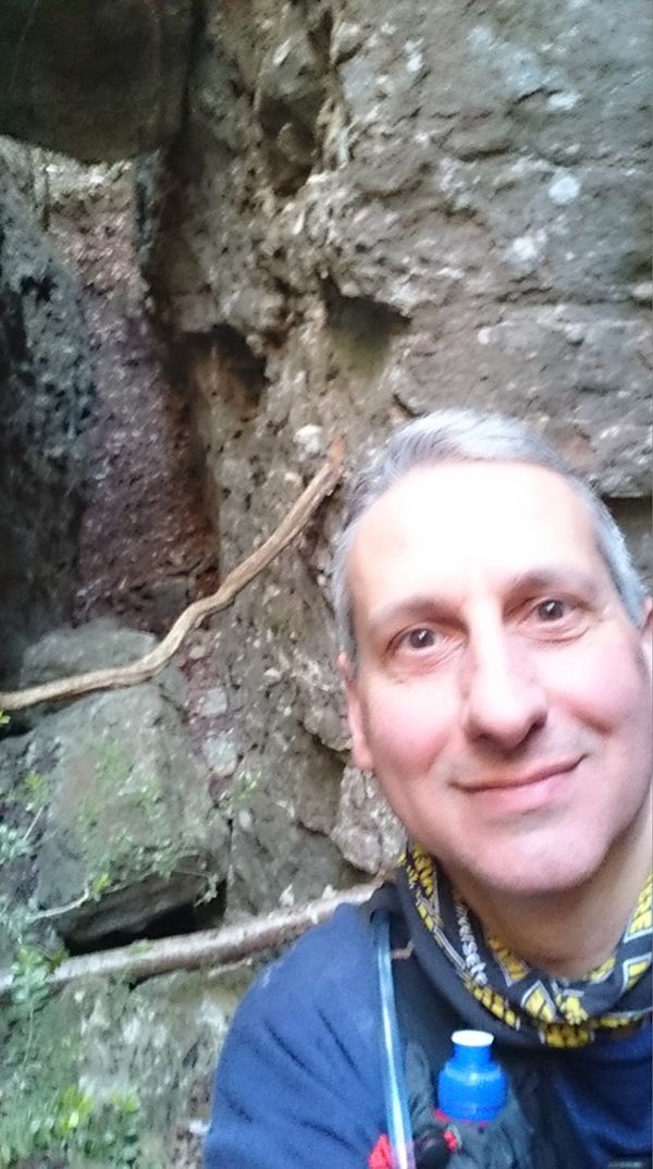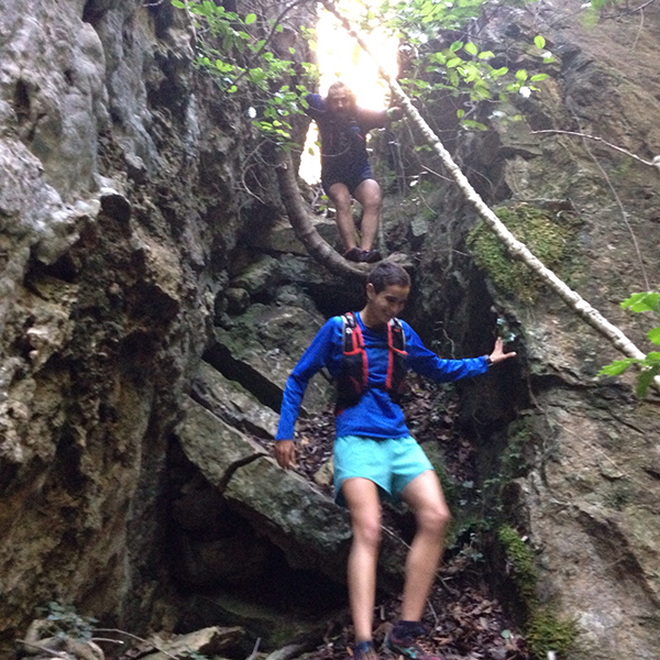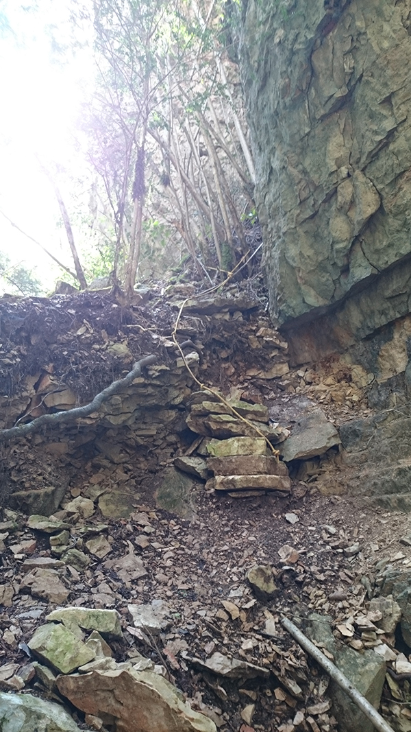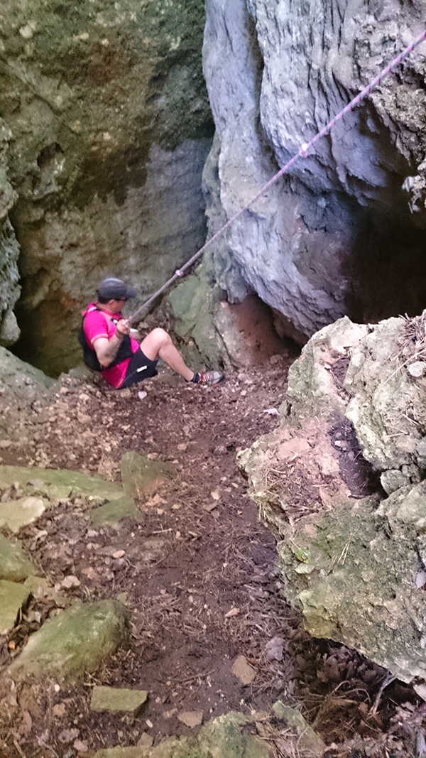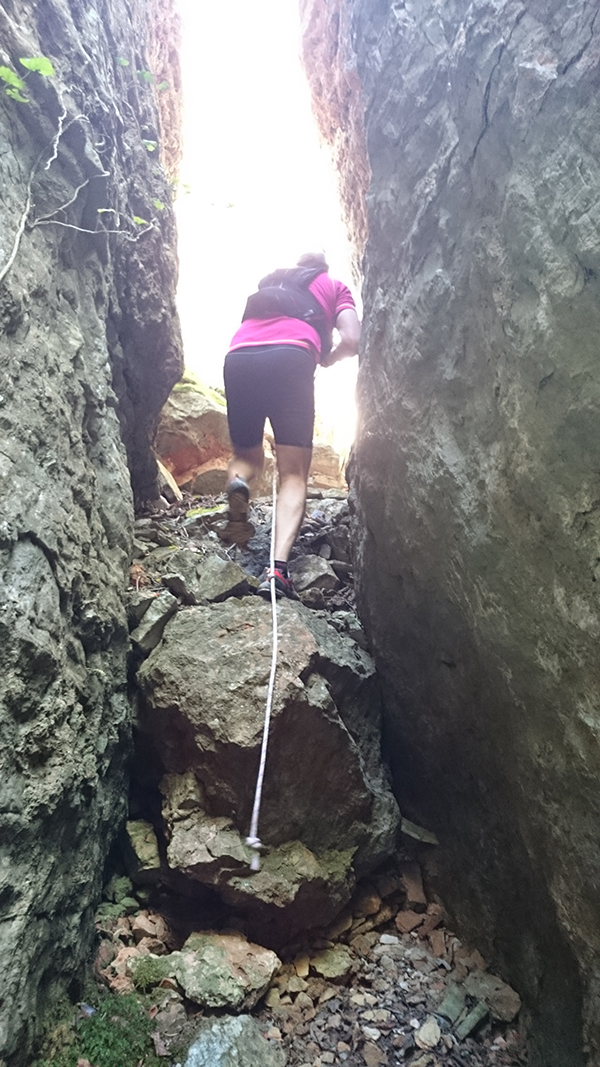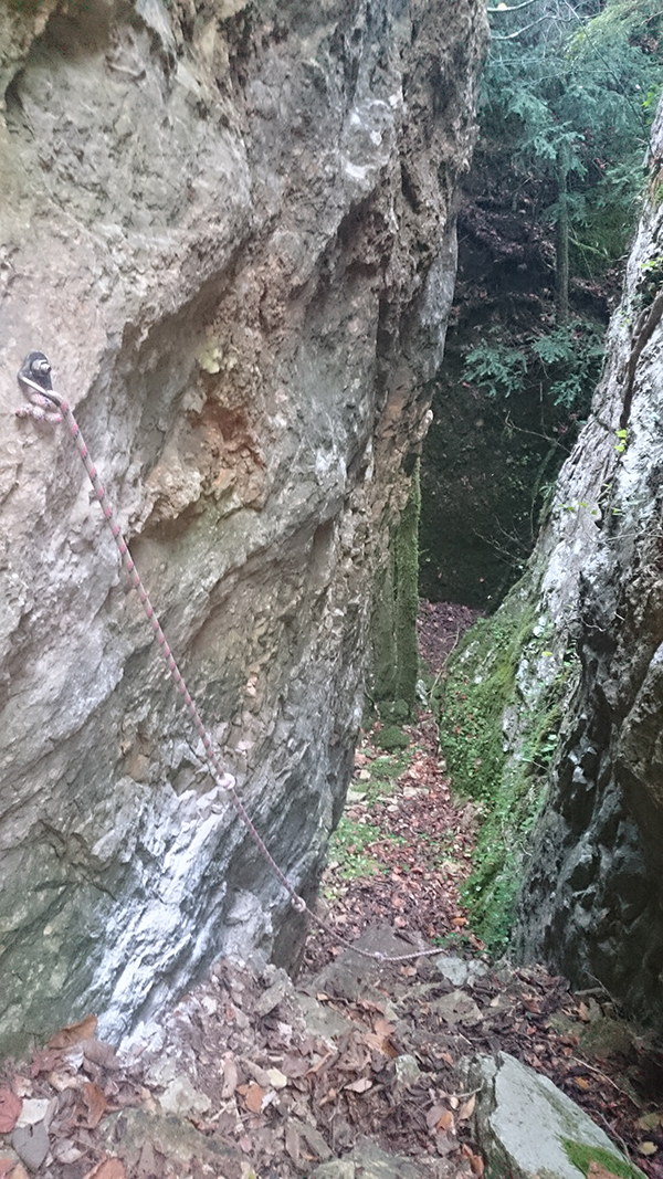 En aquest pas curt però amb forta pendent i molt relliscós tenim la sort que han posat una corda per ajudar-nos.
