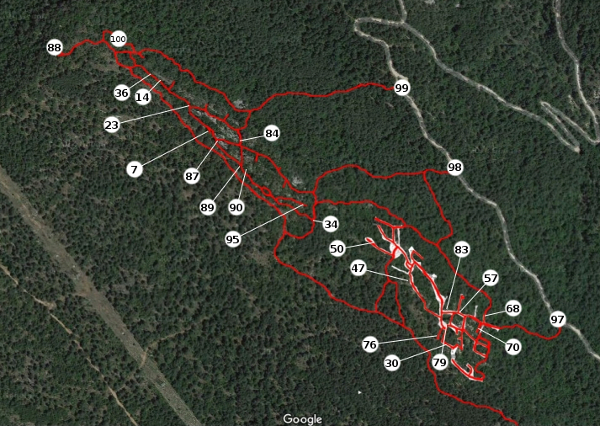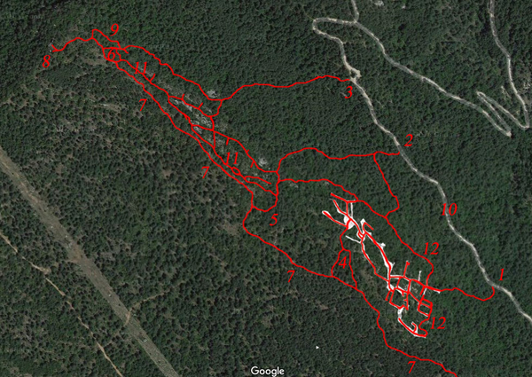 El mapa topogràfic és només del racó dels Avencots, dificil d'arribar si no es coneix. Es pot arribar per dalt per la 1ª entrada de la senda que voreja la part superior dels Avencots en direcció a la Roca del Migdia, per la Boca 6, per la Boca 5 que dificil és arribar-hi si no es coneix perquè cal anar l'últim tram per el bosc selvàtic o per la Boca 4 si se sap arribar pel sender que puja per la 1ª entrada de baix des del camí que va del Coll del Pla del Agustenc cap a la Febró. Més endavant s'anirà explicant-ho tot.