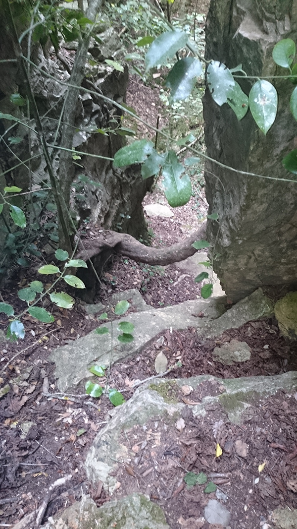 Aquest pas té una curta però forta pendent que amb l'ajuda del tronc de l'arbre ens permet millor el seu pas.