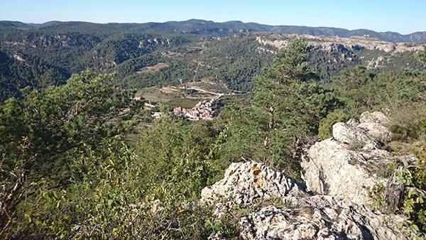 Des d'aquest grupet de roques (Roca del Migdia) es pot veure a baix el poblet de La Febró