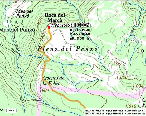 Per arribar-hi des del Coll del Pla de l'Agustenc seguirem cap als avencs i coves de la Febró, les voregem i seguim endavant, en una bifurcació agafem la variant que remunta un turó, i continuem fins unes roques en disposició circular amb un piló central foradat (potser d'un antic rètol), pocs metres endavant a l'esquerra del camí veiem una gran fita que ens orienta entre la vegetació, cap a una depressió paral·lela al cingle on s'ubica la boca de la cavitat. A uns 70 metres al SO de la Roca del Marçà. En total uns 20 o 25 minuts de camí. La cavitat fou descoberta casualment l'any 1970 per membres del GIEM (Grup d'Investigacions